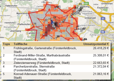 Eine Möglichkeit besteht darin, ein standortoptimiertes Marketing mit Hilfe einer Standortanalyse zu forcieren. Eine solche Standortanalyse kann anhand einer starken räumlichen Differenzierung sehr deutlich aufzeigen, wo innerhalb Ihres Einzugsgebietes das meiste Kundenpotenzial schlummert, bzw. wohin Sie Ihr Marketing fokussieren sollten.